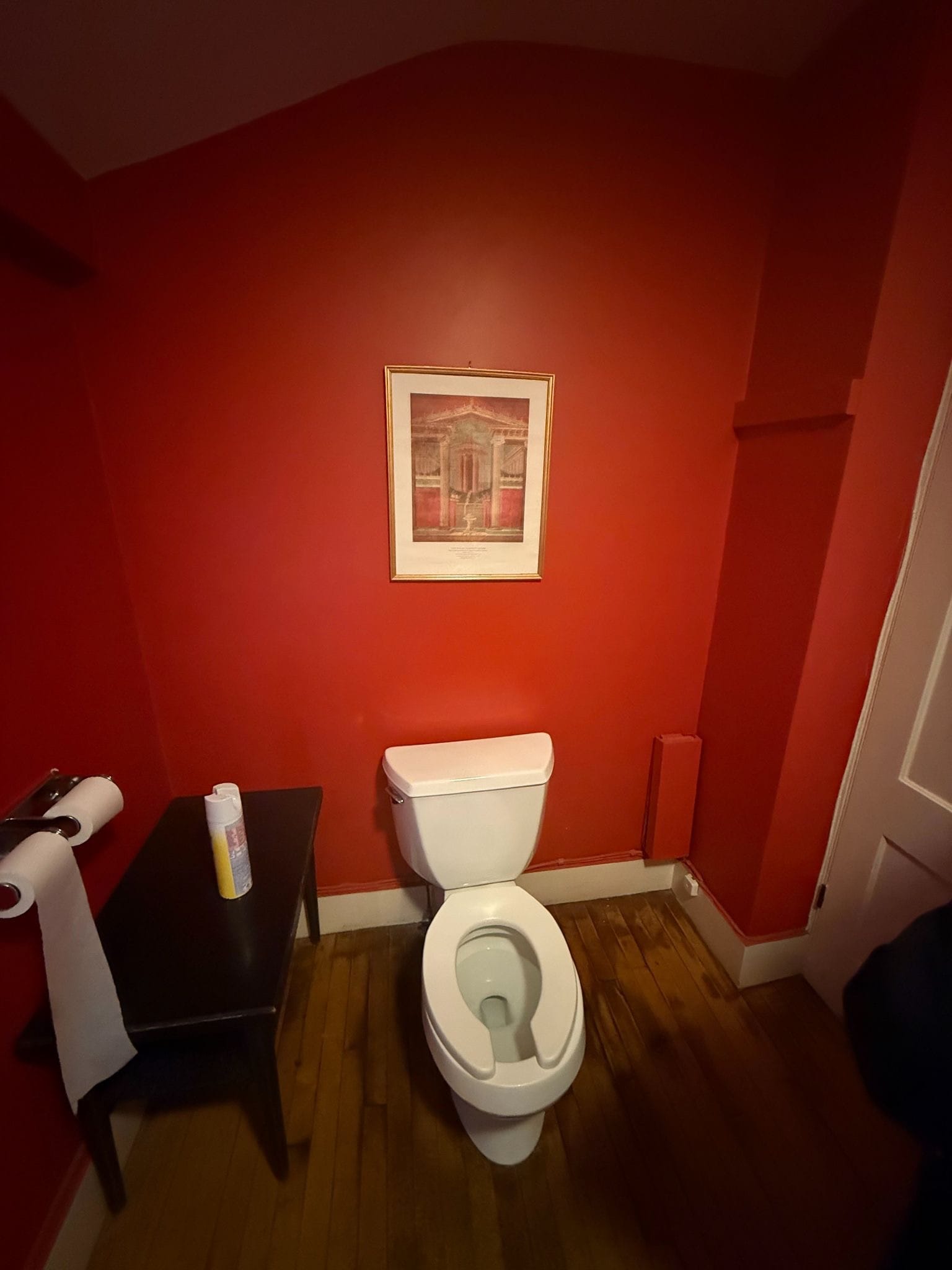 You go up the steps to the house, and immediately book it upstairs (if you’re scared, imagine you’re holding the soft, gentle, and incredibly clean hands of the “Bathroom Bulletin” writers). From there, take your pick of the gender-neutral bathrooms, which we’ve aptly named number one and number two — they’re across from each other. You might fumble with the lock a little bit or struggle to find the light switch, but at least your butt will be on the toilet seat when you need it.