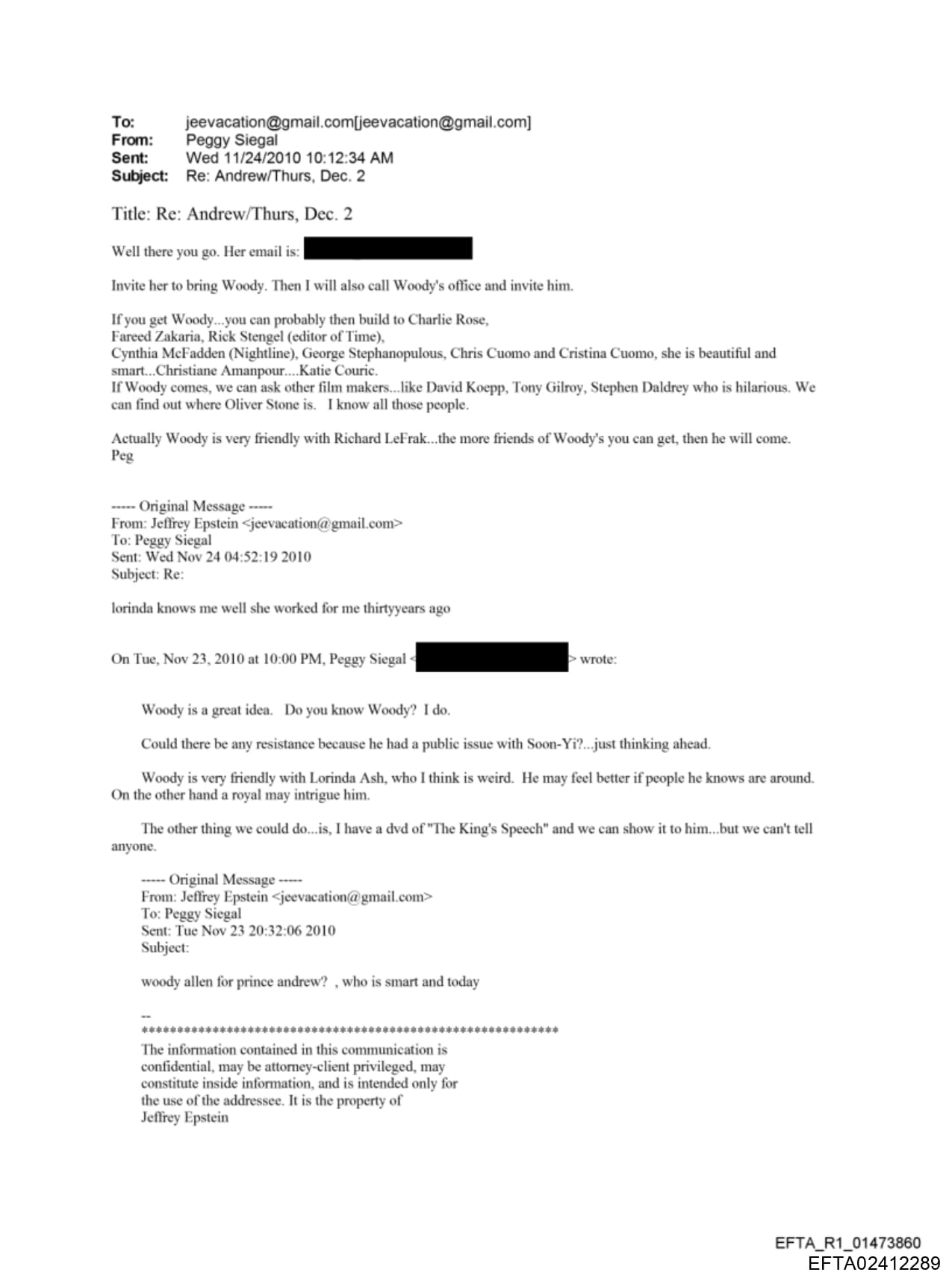LeFrak was invited to another dinner with Epstein in Dec. 2010. Publicist Peggy Siegal, Epstein’s close friend, and the sender of many such emails, noted that he was “waiting to hear from Richard LeFrak […] Richard wants to come..he is checking with Karen [LeFrak].” However, LeFrak ultimately did not attend. Other invitees included Woody and Soon-Yi Allen. In a previous November 2010 email, Siegal noted that Allen — who has had a longtime friendship with Epstein — was “very friendly with Richard LeFrak.” She explained that “the more friends of Woody’s you can get, then he will come.” According to a Variety article, Siegal had “welcomed Epstein home from prison” after he was released in 2009.
