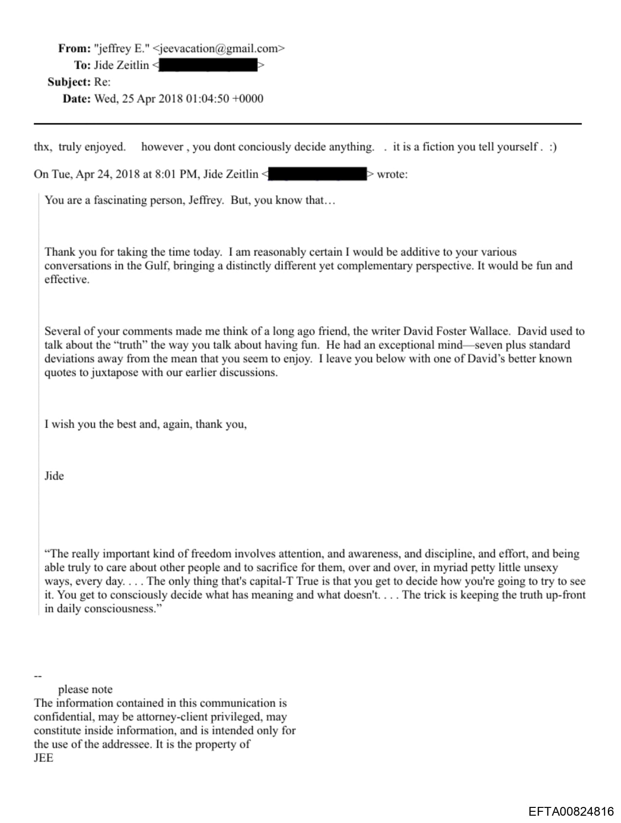 During one email exchange with Steve Bannon — the executive and former White House Chief Strategist under Trump and previous coworker to Zeitlin at Goldman Sachs — on Feb. 23, 2018, Epstein wrote that “jide, I know who you are. no need for credentials. if you are free call now.” After a meeting between the two later in New York, Zeitlin wrote to Epstein on April 24, “You are a fascinating person, Jeffrey, but you know that…” In the same message, Zeitlin later referred to classmate and “Infinite Jest” writer David Foster Wallace ’85 as “a long ago friend.” Zeitlin attached a quote from Wallace that he thought Epstein would resonate with, including the rationale, “David used to talk about the ‘truth’ the way you talk about having fun.”