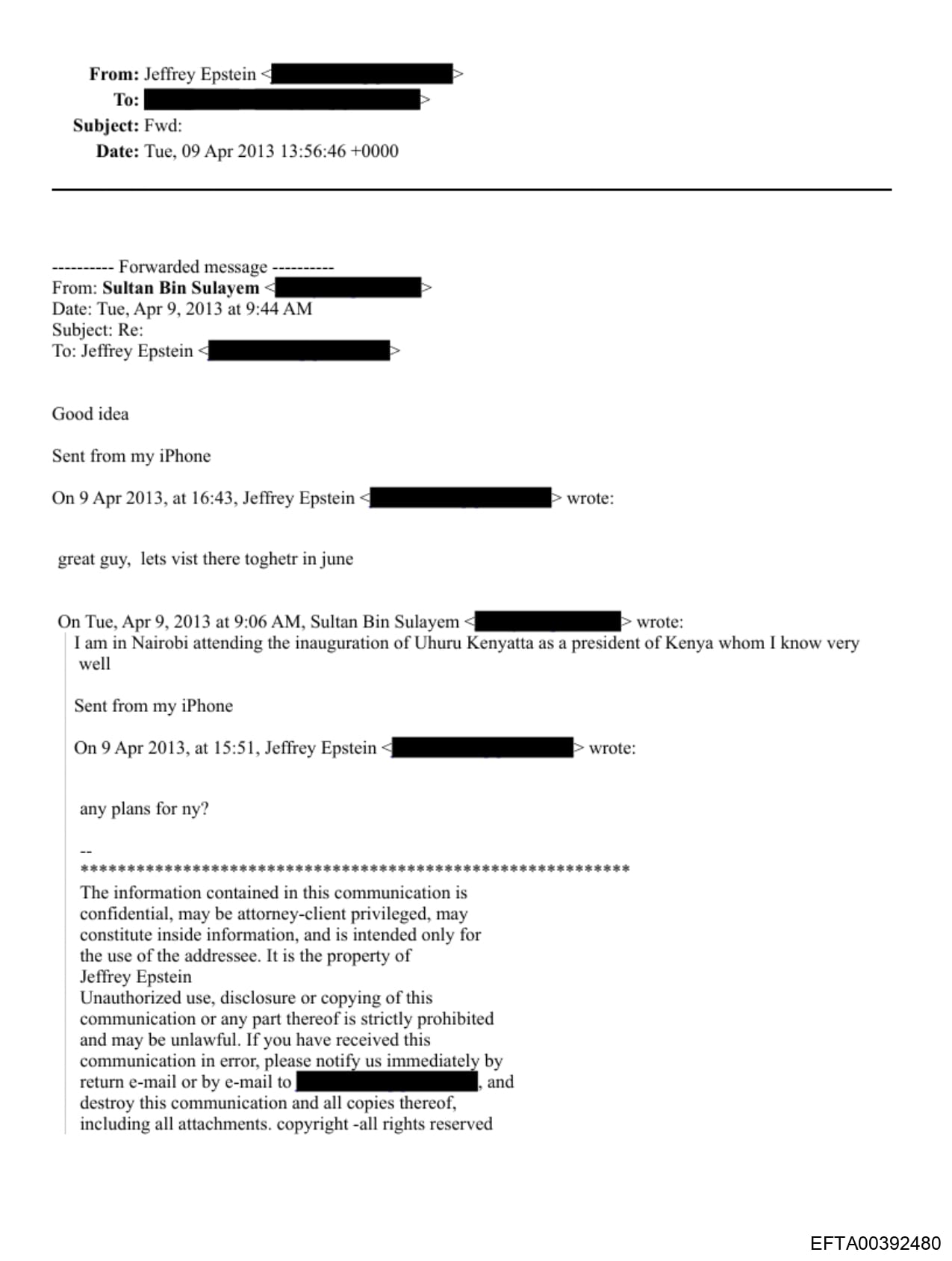 There are no documents featuring direct communication between Epstein and Kenyatta, but there are multiple correspondences between Sulayem and Epstein about Kenyatta. Kenyatta’s first mention in the files appears on April 9, 2013, in which Epstein asked Sulayem if he had plans in New York, to which Sulayem said, “I am in Nairobi attending the inauguration of Uhuru Kenyatta as a president of Kenya whom I know very well.” To this, Epstein responded, “great guy, lets vist there toghetr in june.”