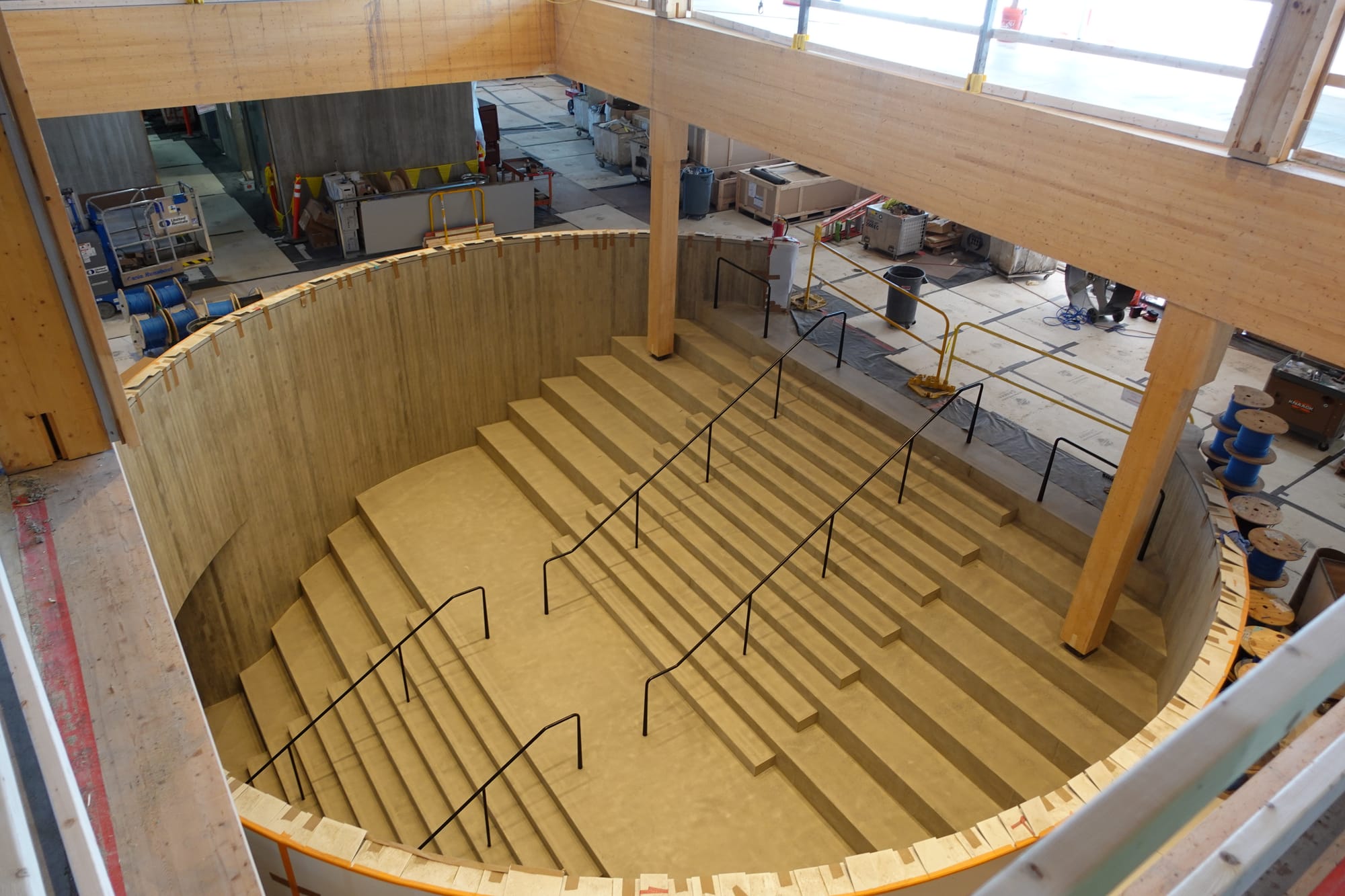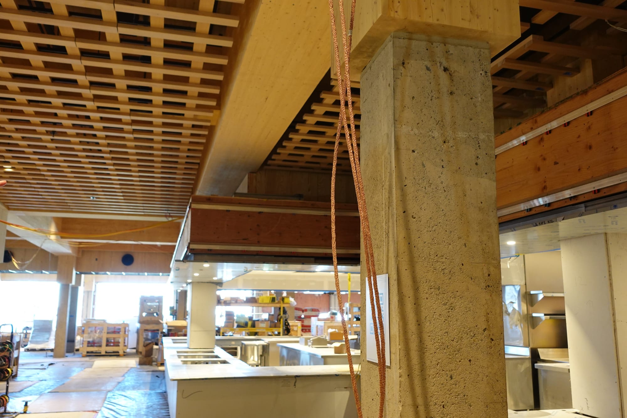 Davies noted that all concrete pillars on the second floor are remnants of the former Merrill Science Center that have been repurposed and connected to the timber ceiling. In addition, the entire SCDC reuses the former science center’s concrete foundation. This design measure reduces the building’s carbon footprint by 440 tons.