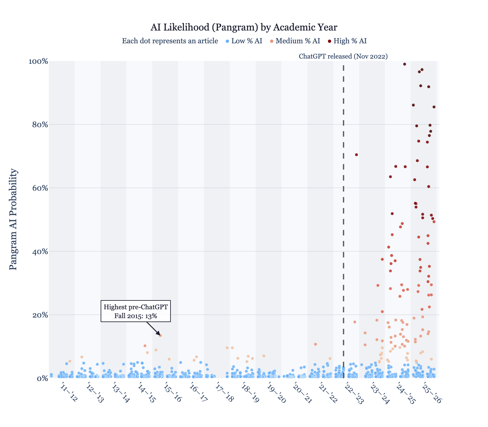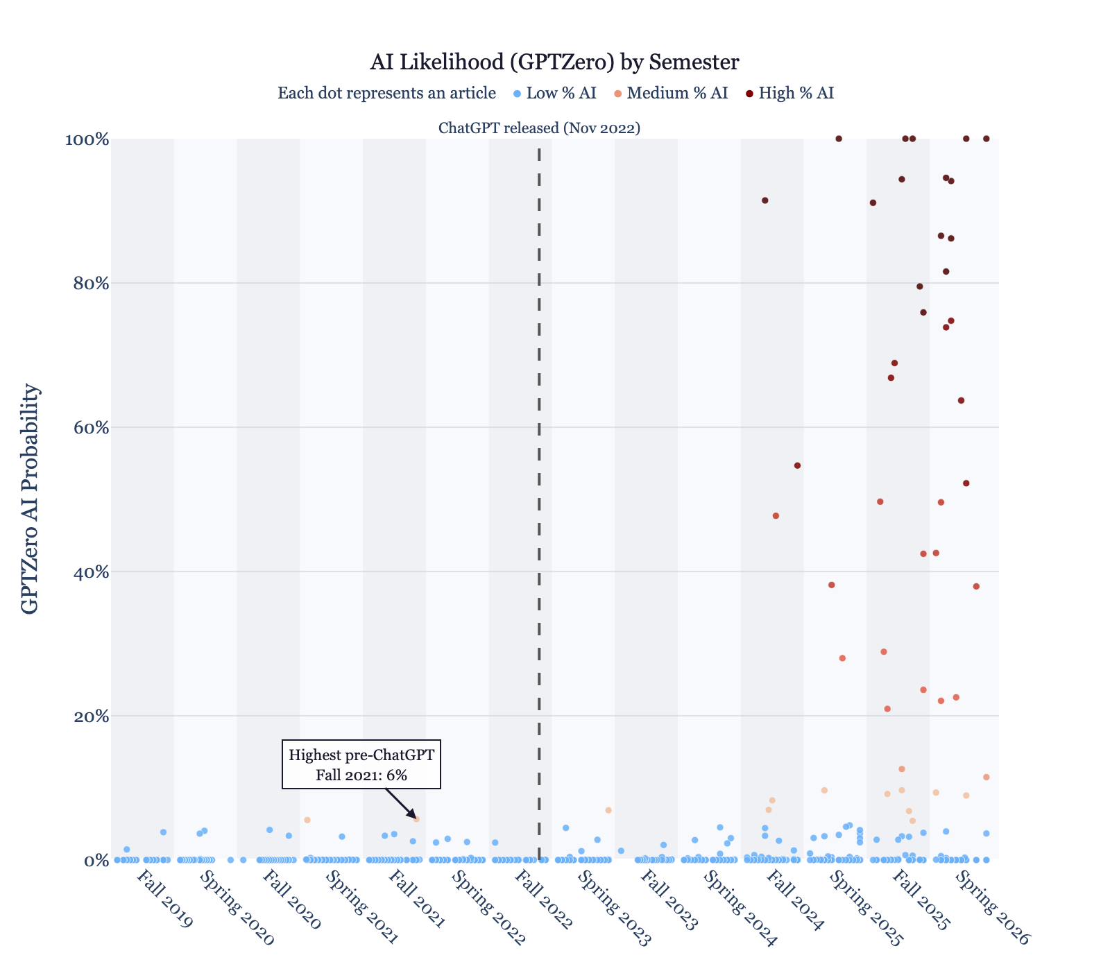 For a second opinion, I checked results with another tool called GPTZero, which Business Insider considers the best free AI-detection software. For GPTZero, I only went back to fFall 2019.