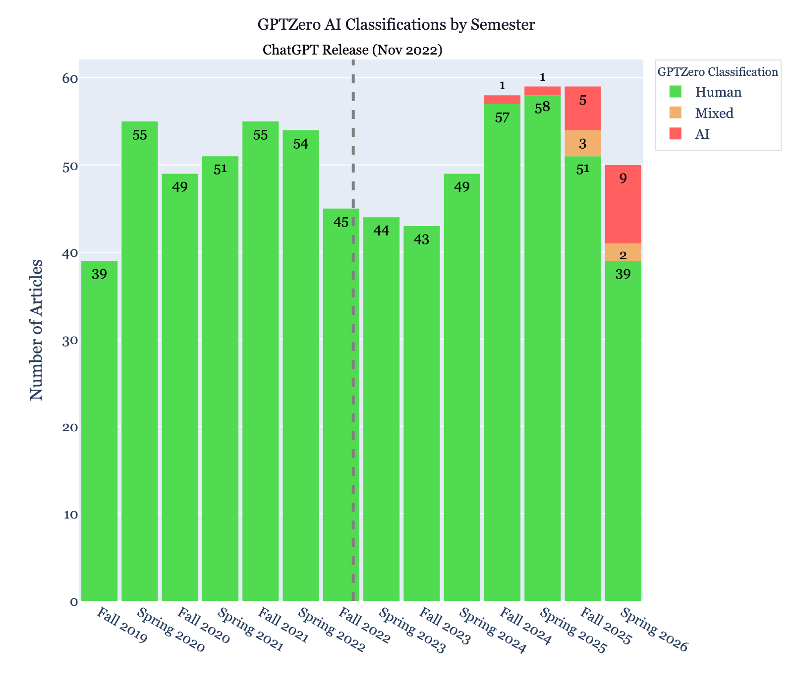 I found the same pattern. Not a single false positive before ChatGPT was released, and very little flagging until this year. For 2025-2026, though, GPTZero classifies 17% of articles as containing AI-generated prose.