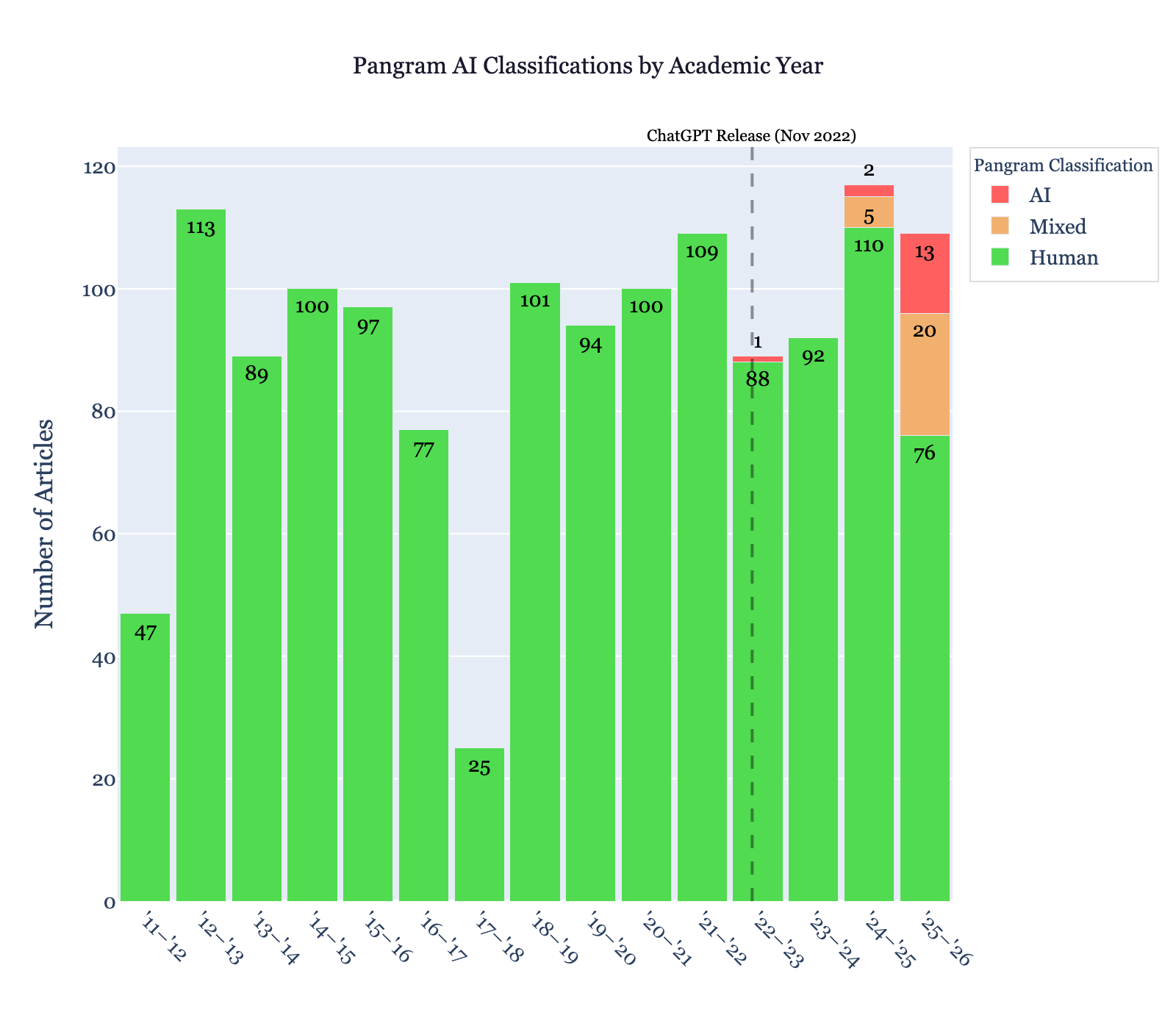 AI use is notoriously hard to prove, but I’ll do my best to make my case. I took 1,359 Amherst Student opinion articles published from the start of the 2011-2012 academic year until April 8, 2026, and put them into an AI detection tool called Pangram. Pangram classified each article as being written by a human, a language model, or a mix of both.