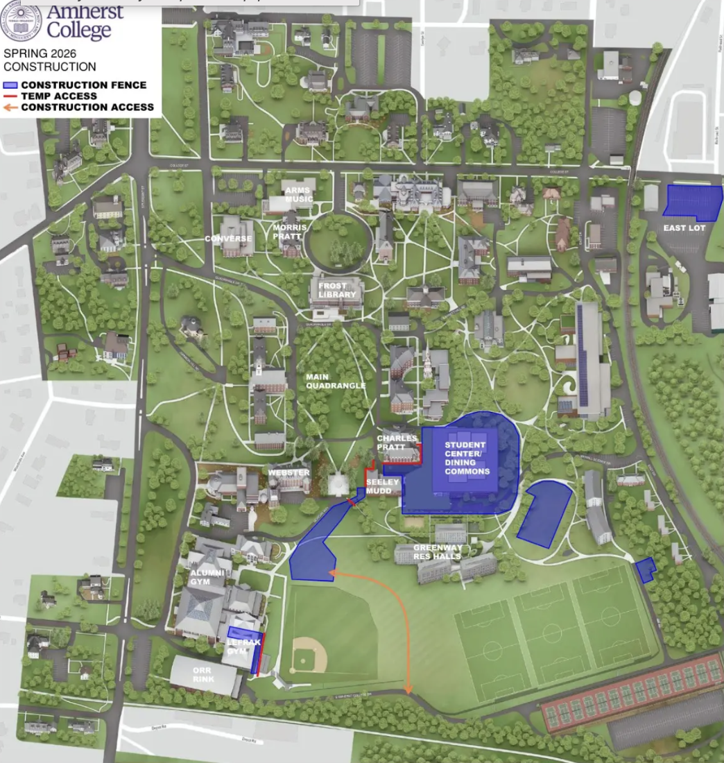 Prior to the 2025-26 school year, students were encouraged to consider not bringing vehicles to campus, and parking regulations in faculty and staff lots were strictly enforced as alternative student parking areas absorbed demand. The East Lot reconstruction consists of two related but distinct projects: The completion of a new centralized food preparation facility and the continued installation of geothermal infrastructure as part of Amherst’s Climate Action Plan.