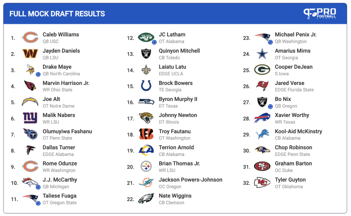 Vaughn: Wide receivers Malik Nabers and Rome Odunze are common picks here, but I don’t think new head coaching hire Jim Harbaugh will go in either direction. He’s always been someone that has prioritized building elite offensive lines, so I think he’ll be enticed by the idea of pairing Joe Alt with Pro-Bowler Rashawn Slater. The Chargers could look to the second round to add a talented pass-catcher. - New York Giants — Malik Nabers (WR)