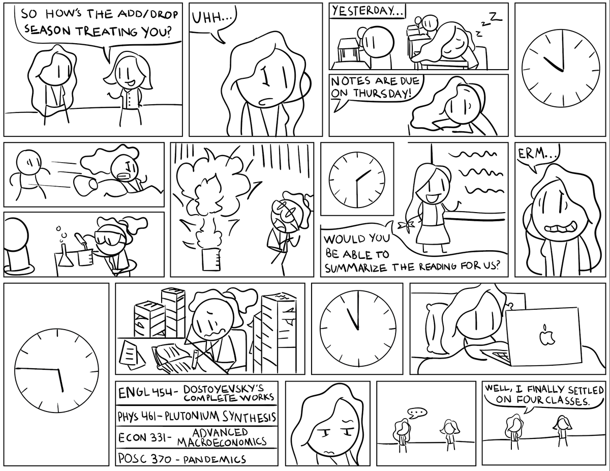 Cartoonist and Staff Podcaster Miles Garcia ’25 reminisces on the difficulties of juggling classes during the Add-Drop period.
