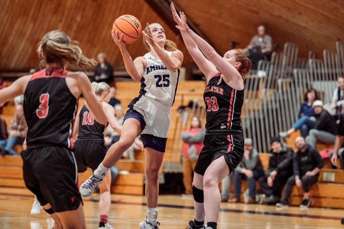 Over the next two quarters, the Mammoths would build off of that lead with key points from Kori Barach ’25 and Patel. However, midway through the second quarter, New Jersey would close their gap down to one point, 19-18. This time, Barach answered with a three of her own with three minutes remaining in the first half to make it 33-28 Amherst. A Barach defensive rebound then led to an Anna Tranum ’26 jumper that made it a seven-point Amherst lead. A pair of defensive rebounds led to two free throws from Barach and a jumper from Sylvia Liddle ‘26 came with one minute left to give the Mammoths their halftime lead of 39-28.