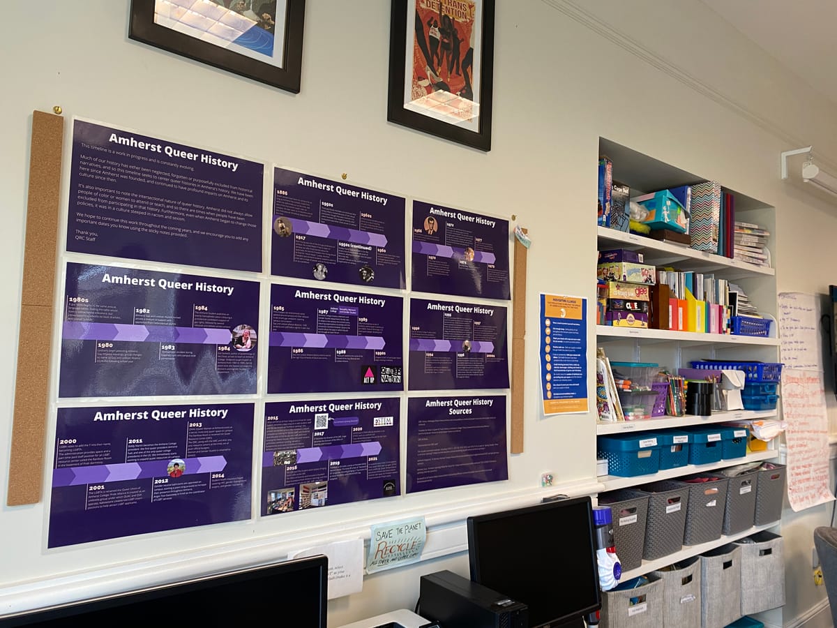 A timeline hanging in the QRC documents figures, groups, and pivotal moments in the history of queer people at Amherst. QRC staff reflected on their experience researching and designing the timeline, and their belief in its value.