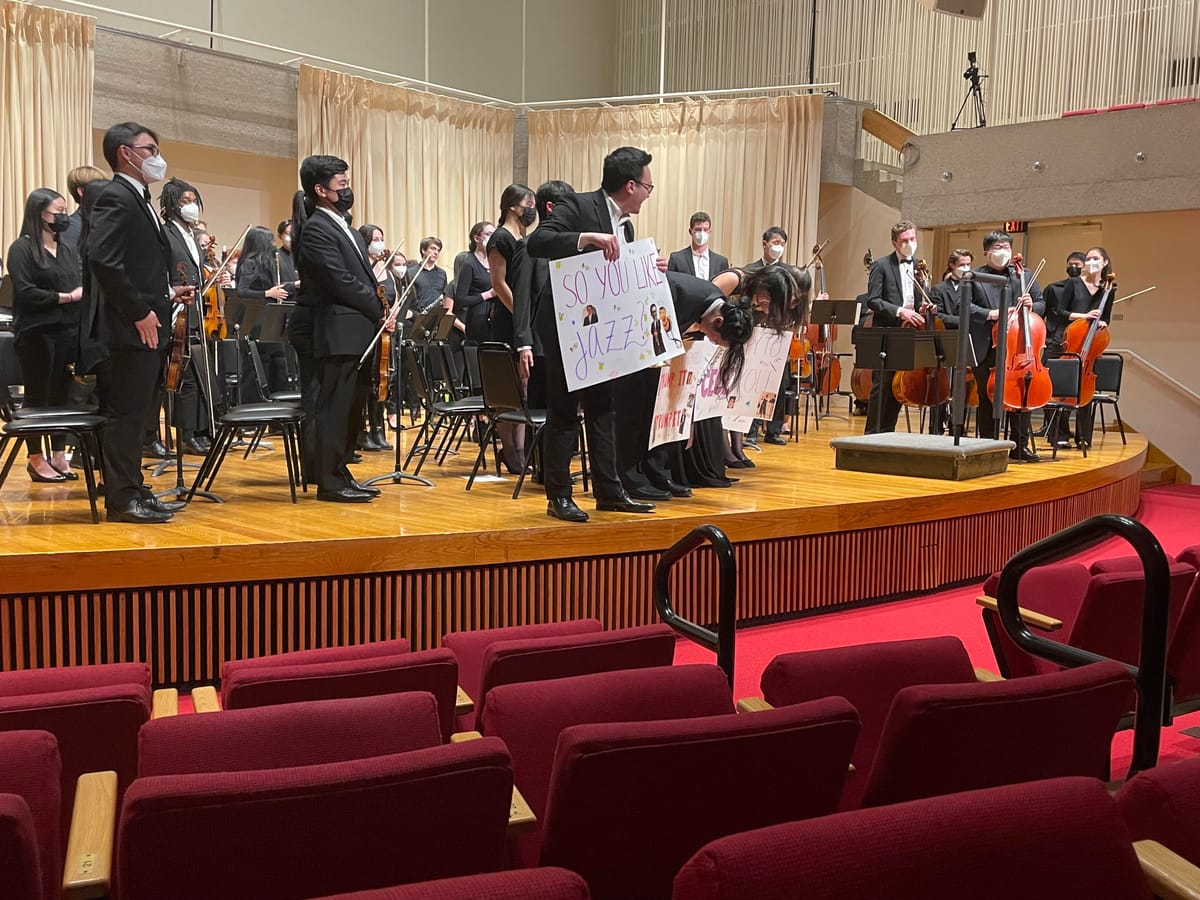The concert closed with Chandler, a longtime orchestra member and former teaching assistant, and his arrangement of “Stardust” by Hoagy Carmichael. Unexpectedly for the audience, Chandler cued in the orchestra himself, without Swanson conducting or anywhere in sight. To Swanson, it was “unfinished business,” because Chandler had wanted to perform this arrangement at the end of his senior year in 2020 before the pandemic hit. It was a fitting end to the concert: a unified orchestra, pushing their boundaries into jazz, playing confidently and completely even without the guidance of their conductor.
