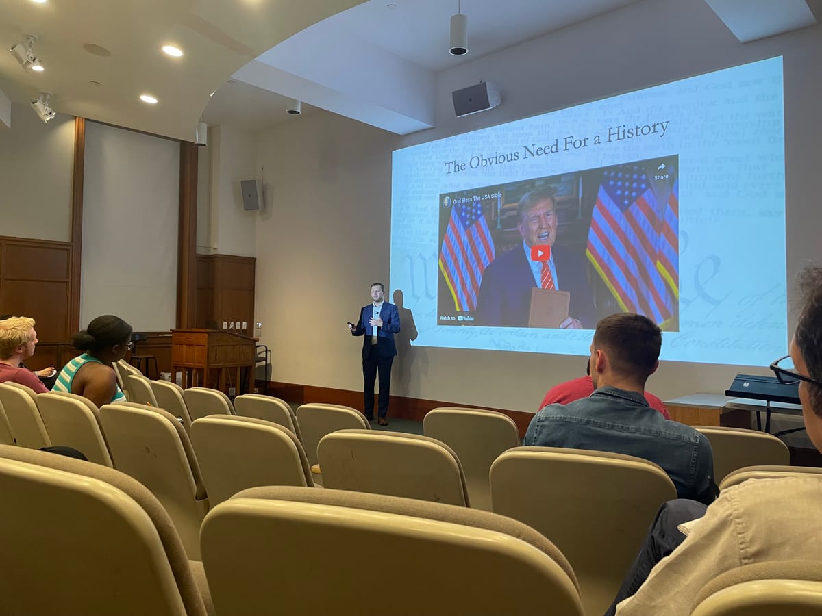 The lecture began with a month-old clip of former President Trump selling a Bible containing the original words of the Constitution. “Religion and Christianity are the biggest things missing from this country,” Trump said. “I think it’s one of the biggest problems we have. That’s why our country is going haywire.”