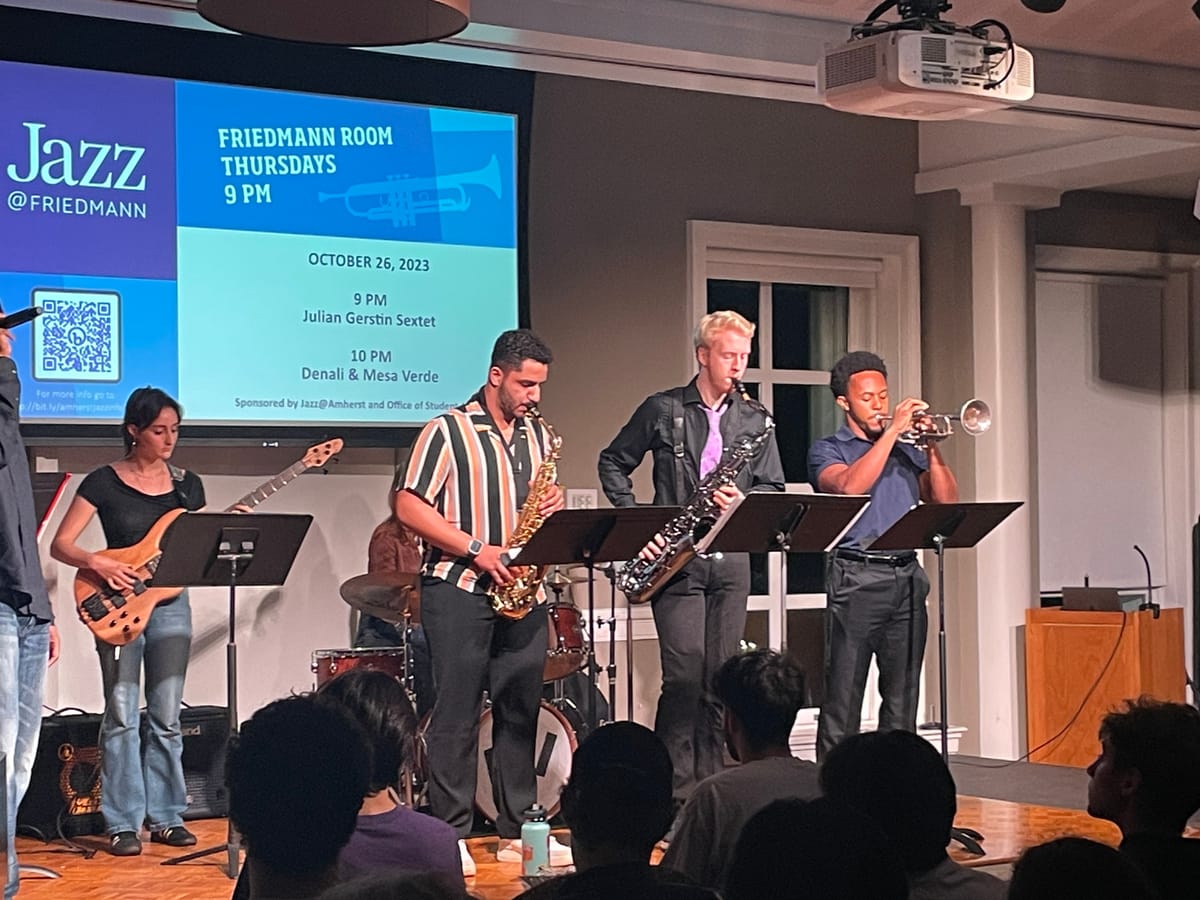 Stepping into the Friedmann Room this past Thursday transported me to another time and place. For the semester’s fourth and final installment of Jazz@Friedmann, the audience was treated to non-U.S. styles of jazz from the Julian Gerstin Sextet and the student jazz combo Mesa Verde. Between these two groups were selections of classic cuts from Denali, another student combo. The groups used a wide array of instruments to showcase the full range of jazz music. Just the sight of three different types of drum made my heart beat in anticipation.