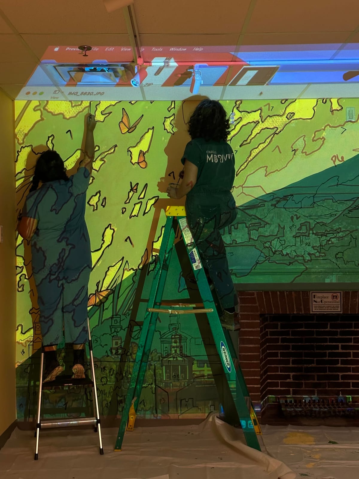 Esta noche, casi un año después, uno de los resultados de sus conversaciones se revelará en las paredes del salón del sótano de Newport: un mural diseñado y pintado por Colectivo Moriviví, un colectivo artístico exclusivamente femenino puertoriqueño, en colaboración con los residentes de Newport. Schroeder Rodriguez obtuvo fondos para el proyecto del Departamento de Español, el Departamento de Estudios Latinx y Latinoamericanos, el Centro para el Compromiso Comunitario, Asuntos Estudiantiles y la Oficina del Presidente.