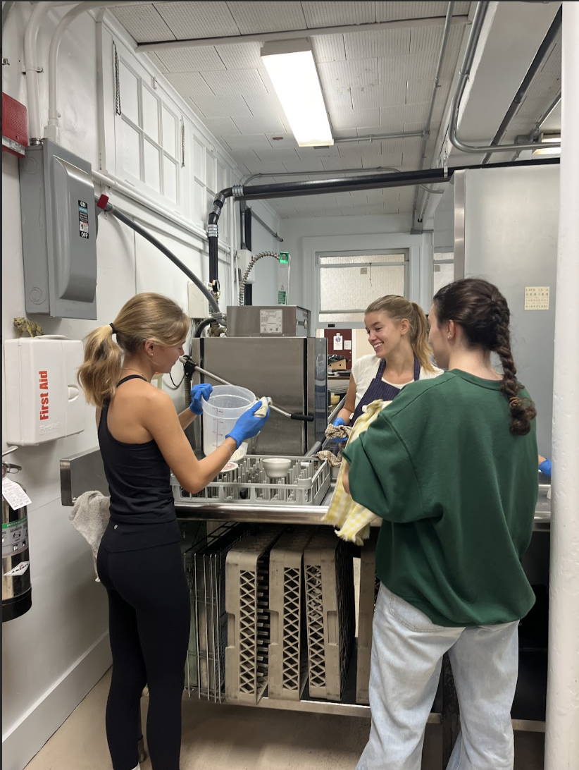 As soon as the dishes were done, there were meals to be served. We exchanged our sudsy gloves for clean new ones and wheeled our first cart out of the kitchen. Although intent on emptying our pot of vegetables and tofu, we were soon sidetracked, stuck in conversation with the patrons we were serving. By the time we brought our cart back to the kitchen, we found ourselves moving differently — according to the rhythm of the community we had joined.