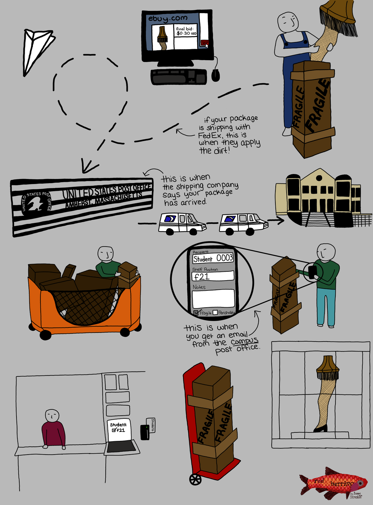 Red Herring cartoonist Isaac Streiff ’24 presents the journey of a package through the delivery system traveling to the mail office at Keefe Campus Center.