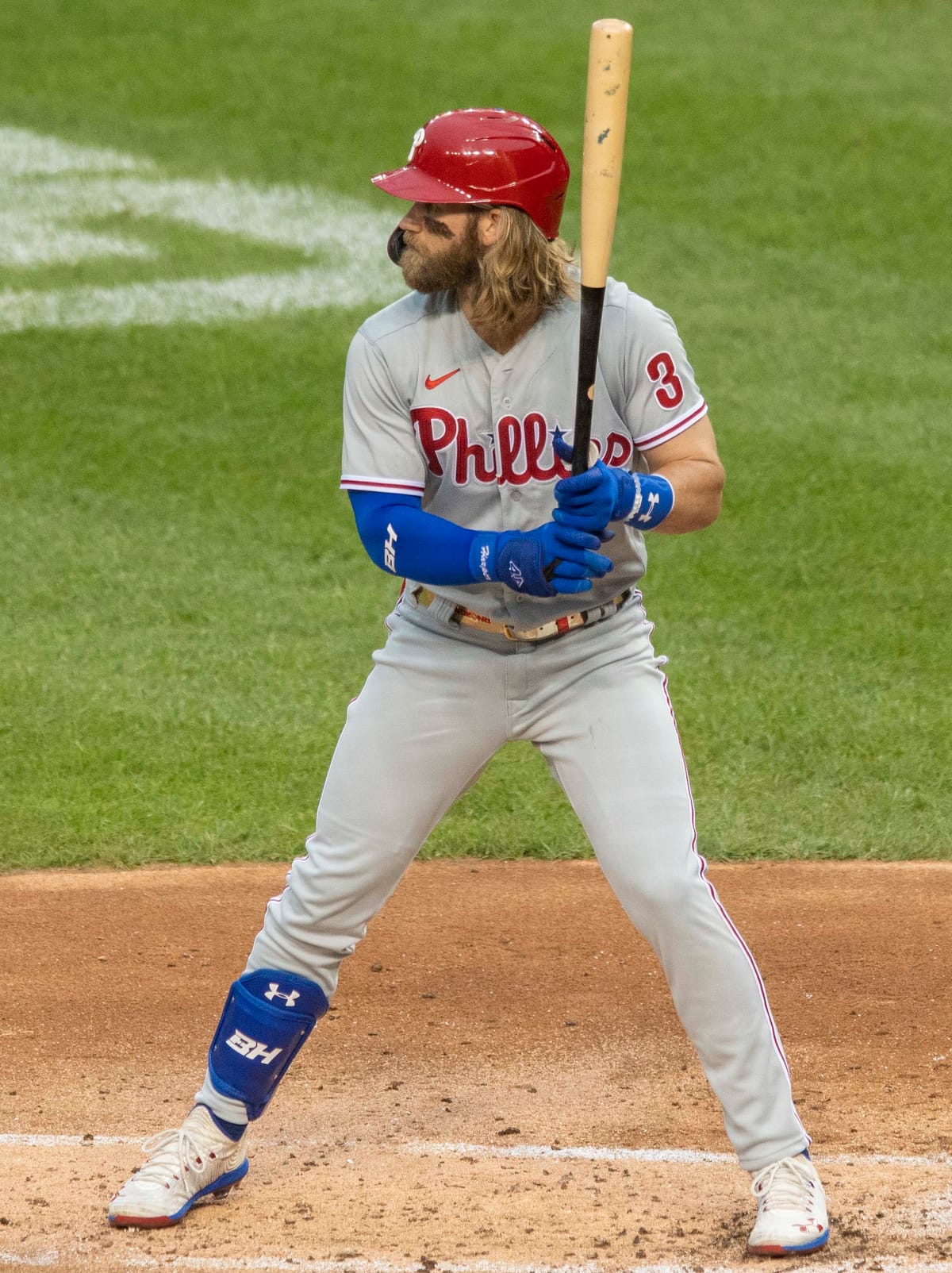 After a leadoff single into left by J.T. Realmuto, Bryce Harper puts on a last touch of pine tar and rosin on his bat, straps on his batting gloves, and prepares for the biggest at-bat of his career.