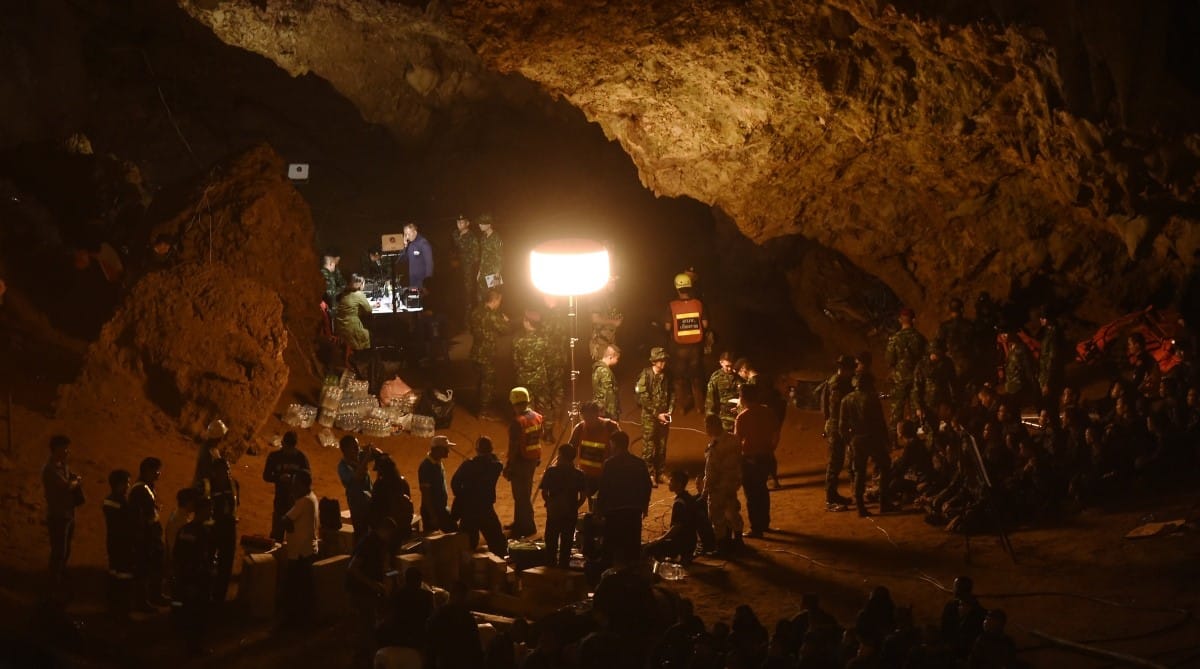 Two British divers emerge from a six-hour dive through a submerged cave beneath a mountain in Thailand. Along with Thai Navy SEALS, they’ve been searching for a youth soccer team and their coach, who disappeared in the cave 10 days prior during an early monsoon rain. “We’ve found the boys. They’re alive,” the first diver, John, announces to a chamber full of SEALS, handing them a waterproof camera. The SEALS clamber over the rocks to take a look. “Be careful who sees that,” the second diver, Rick, warns the men.