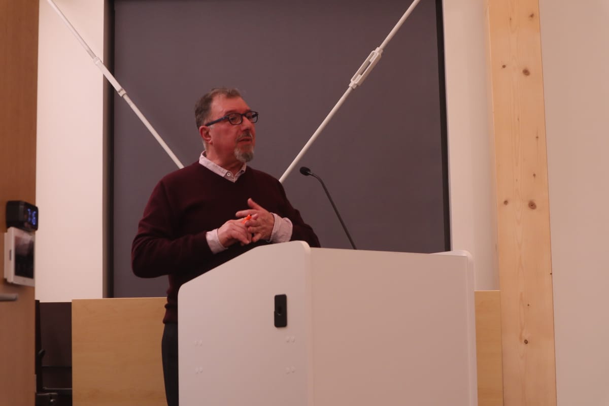 Professor of History and Asian Languages and Civilizations Monica Ringer introduced the event, as she had for the previous talks. She credited Professor of Anthropology Chris Dole and senior managing editor Stacey Zhang ’26 for helping to organize the talks and calling campus attention to the situation in Palestine.
