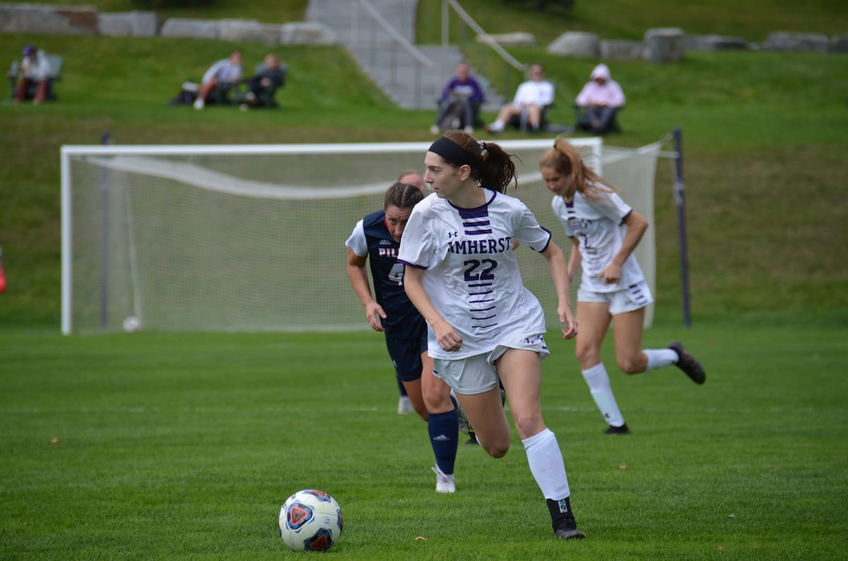 The second half started with the Mammoths leading 1-0, and the team continued to command the field. Cassie Chin ’22 had her first shot of the game in the fifty-first minute, saved by New England’s keeper, Emily Sashko, and Fiona Bernet ’25 followed up with a shot in minute 56. Izzy Geneve ’23, Charlotte Huang ’25, Alyssa Hyunh ’25 and Cassidy Duncan ’25 all had shots of their own, as well. In minute 74, Kum received a pass from Schwartz that allowed her to record her second goal of the weekend. Amherst’s attacking line kept testing the defense, including two rapid-fire shots from Sarah Vierling ’23, until Nam managed to break through in the last minutes of the game to bring the score to 3-0 for the Mammoths. This victory wrapped up an exciting weekend for women’s soccer.